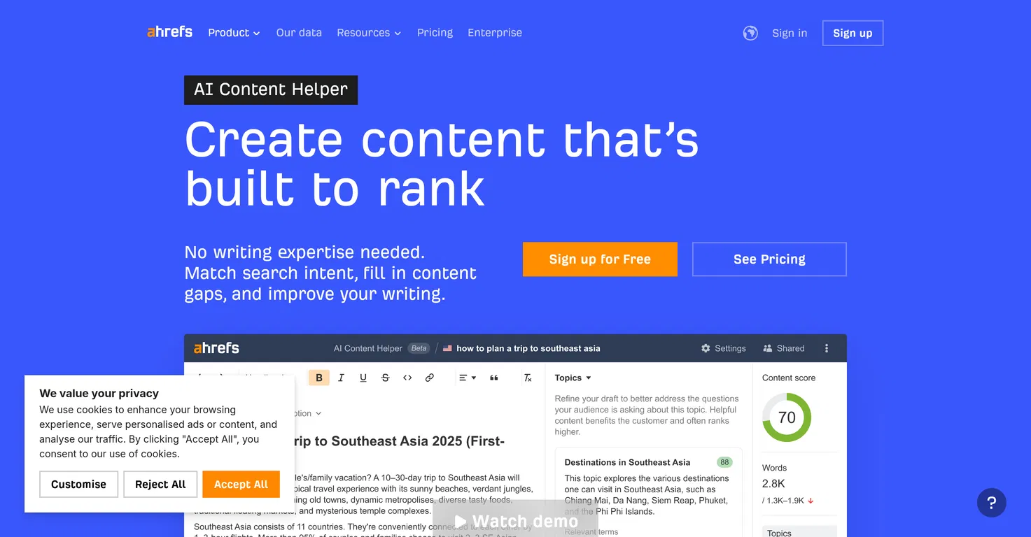 AI Content Helper от Ahrefs — это инструмент на базе искусственного интеллекта, предназначенный для помощи в создании контента, оптимизированного для лучшего ранжирования в поисковых системах. Инструмент призван помочь пользователям соответствовать поисковым запросам, восполнить пробелы в контенте и улучшить свои навыки написания текстов, не требуя обширных знаний в области SEO или написания текстов.