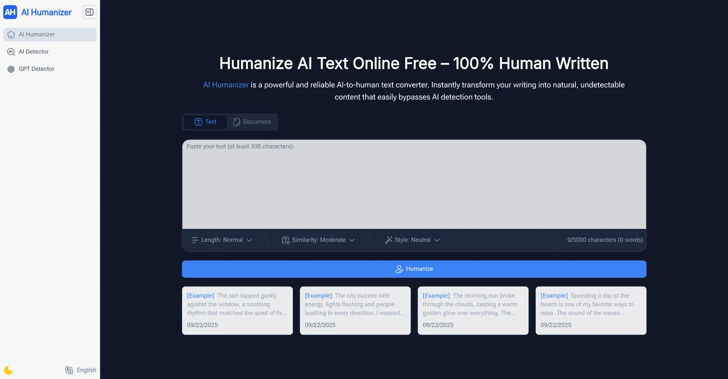 Задуманный как удобный и доступный, AI Humanizer не требует регистрации и предлагает неограниченное использование. Инструмент способен обрабатывать длинные тексты AI и позволяет пользователям настраивать уровень человеческого воздействия - от легкого редактирования до глубокого переписывания.