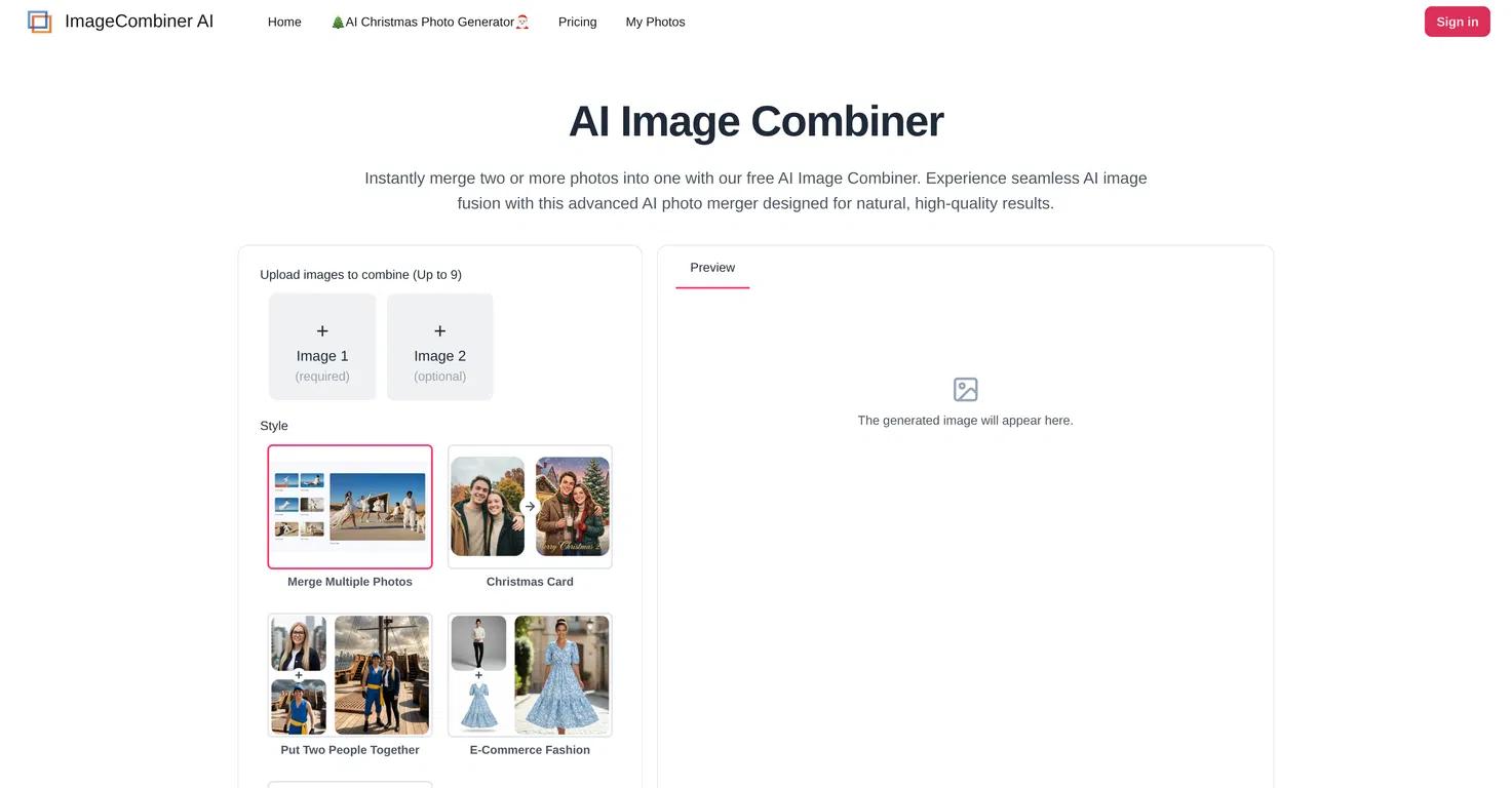 AI Image Combiner — это бесплатный онлайн-инструмент, предназначенный для плавного объединения двух или более фотографий в одно составное изображение с помощью передовых алгоритмов искусственного интеллекта.