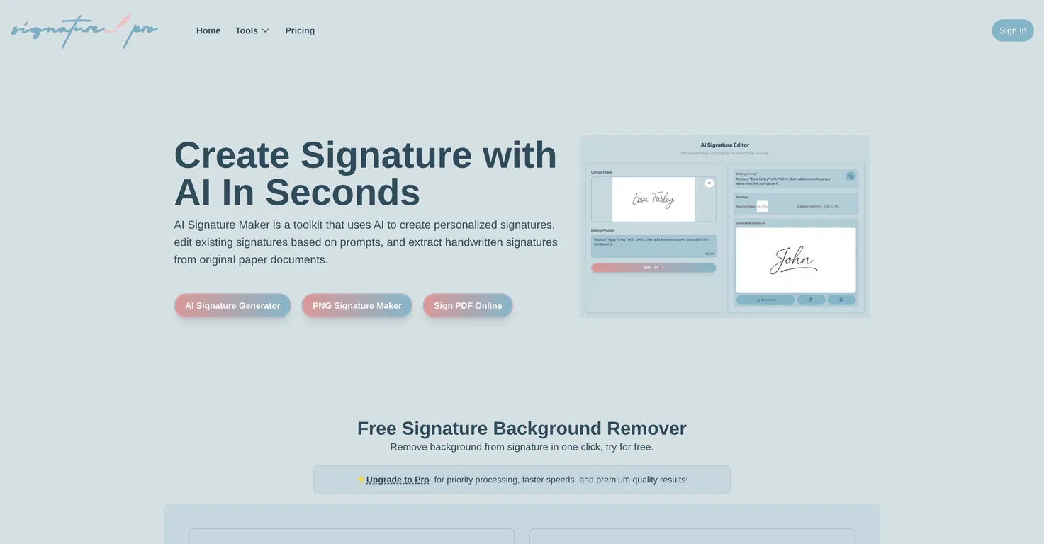 AI Signature Generator Pro - это универсальный набор инструментов для создания цифровых и рукописных подписей на основе передового искусственного интеллекта. Разработанный для профессионалов, компаний и частных лиц, он предлагает беспрепятственный способ создания, редактирования и оцифровки вашей личной или профессиональной подписи всего за несколько секунд.