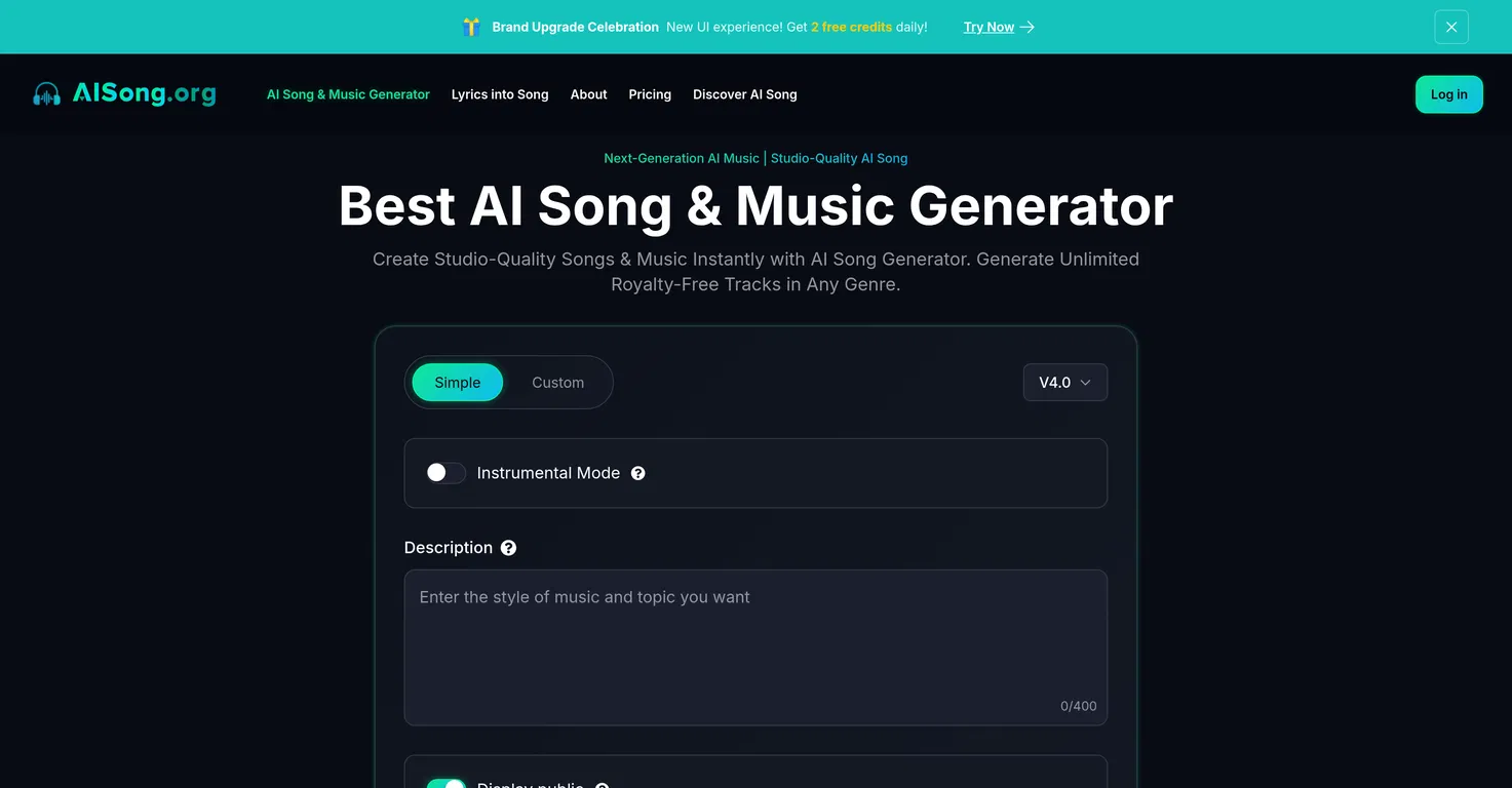 AI Song - это платформа на базе искусственного интеллекта, предназначенная для мгновенного создания песен и музыки студийного качества. Этот интуитивно понятный инструмент не требует регистрации и предоставляет неограниченное количество треков без авторских отчислений в широком диапазоне жанров.