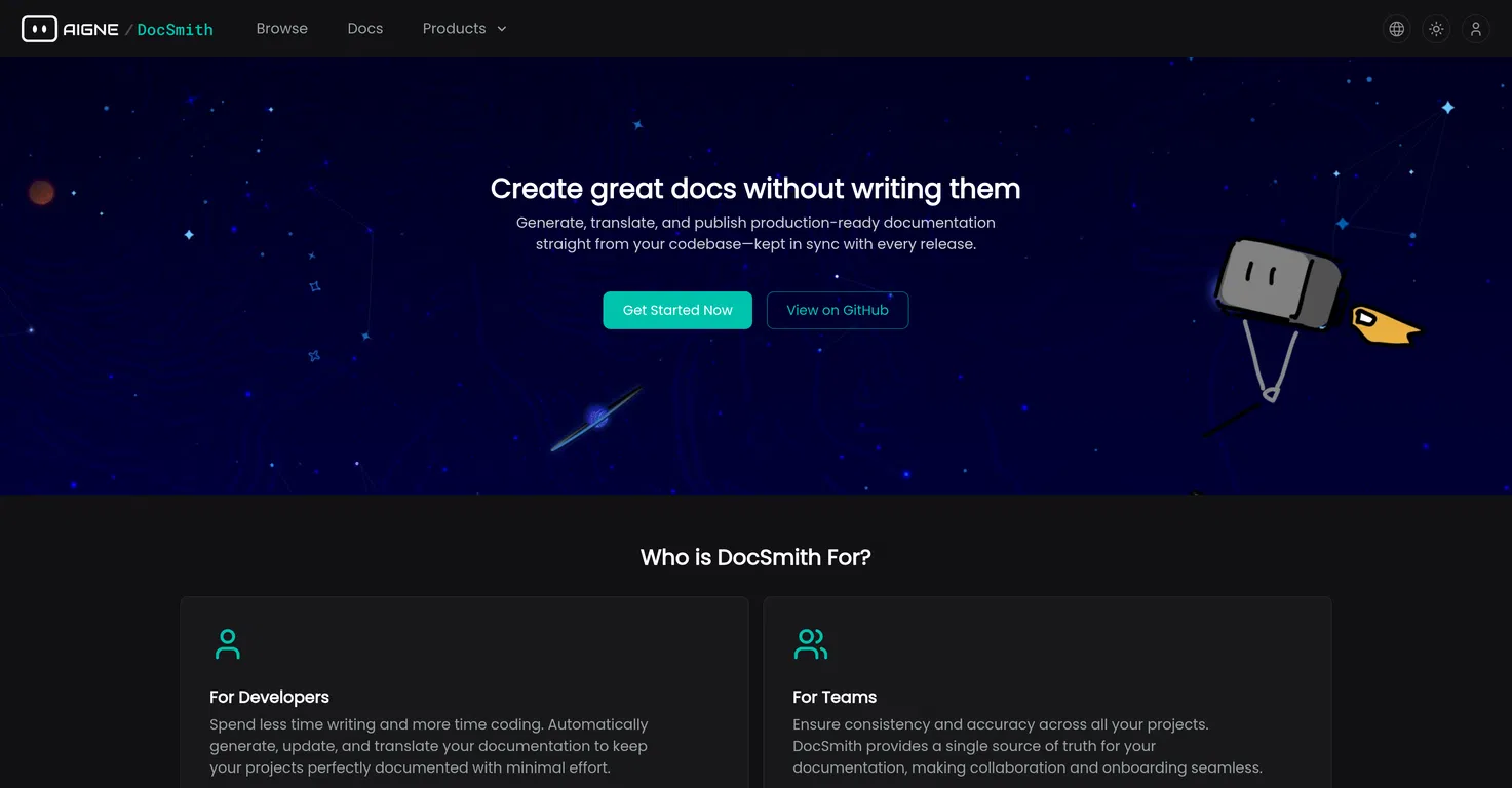 AIGNE DocSmith - это платформа на базе искусственного интеллекта, предназначенная для автономной генерации подробной мультиязычной документации непосредственно из кодовой базы пользователя. Этот инструмент функционирует за счет использования передовых моделей искусственного интеллекта для понимания структуры, функций и нюансов вашего кода и последующего создания точной и актуальной документации.
