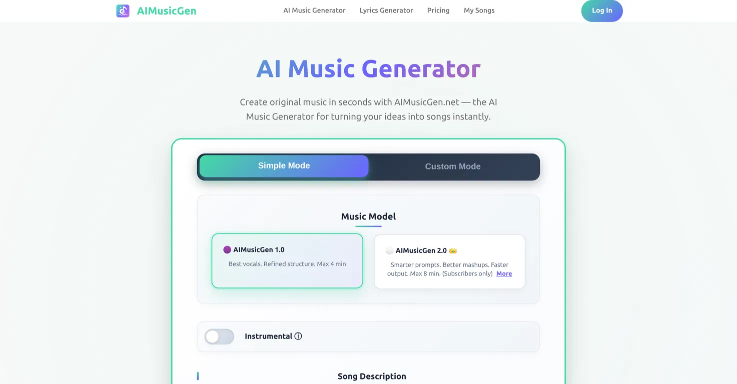 Инструмент AIMusicGen - это платформа на базе искусственного интеллекта, позволяющая пользователям мгновенно генерировать музыку и тексты, воплощая творческие идеи в жизнь. Используя сложные технологии искусственного интеллекта, ИИ применяет понимание музыкальной теории, композиции и аранжировки для создания эмоционально насыщенных и аутентичных песен.