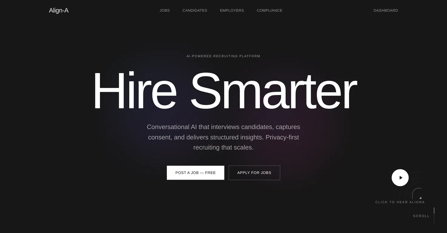 Align-A - это рекрутинговая платформа на базе искусственного интеллекта, ориентированная на практику согласия. Этот разговорный ИИ-рекрутер проводит структурированные интервью с кандидатами, полностью соблюдая нормы GDPR и CCPA, что обеспечивает конфиденциальность данных.