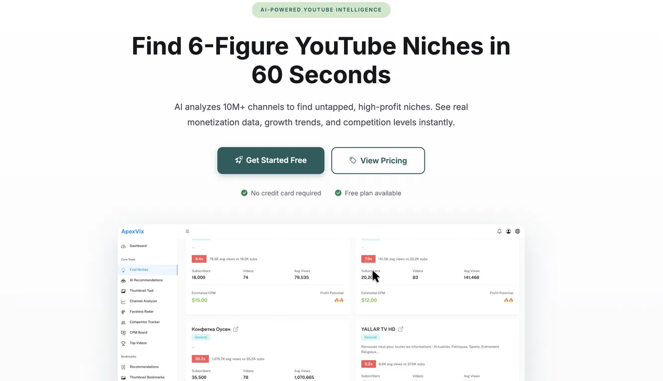 ApexVIX AI - это инструмент для поиска ниш и анализа конкурентов на YouTube, который использует искусственный интеллект для получения информации в режиме реального времени. Инструмент помогает обнаружить прибыльные ниши на YouTube, отслеживая тенденции, оценивая потенциальную монетизацию и анализируя конкурентов.