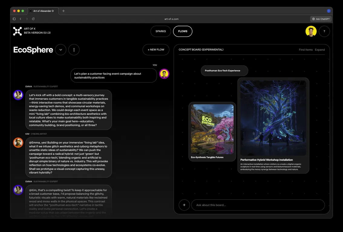 Art of X - это мультиагентная платформа искусственного интеллекта (ИИ), направленная на развитие креативности и инноваций. Ее основная особенность заключается в использовании "искр ИИ", которые призваны облегчить мозговой штурм, проектирование и воплощение инновационных проектов в жизнь.