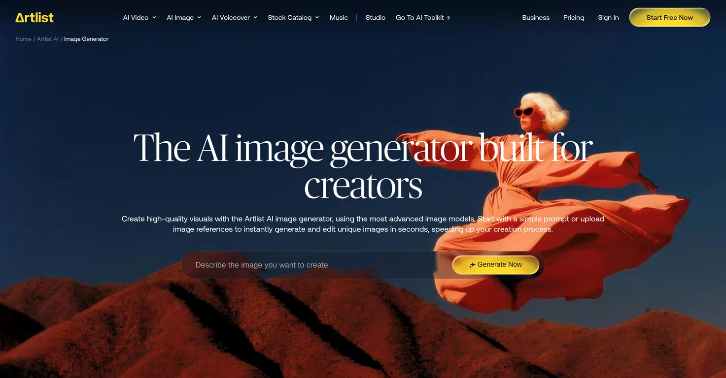 Artlist AI Image Generator - это инструмент, предназначенный для создания высококачественных визуальных изображений на основе подсказок пользователя или загруженных ссылок на изображения. Предлагая выбор самых современных моделей генерации изображений с помощью искусственного интеллекта, он позволяет пользователям генерировать уникальные изображения за считанные секунды.