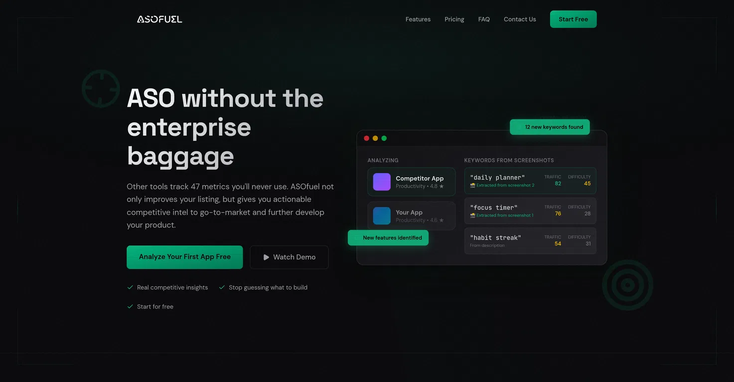 ASOfuel - это инструмент для оптимизации магазина приложений, который поддерживает реальную стратегию продукта, основанную на анализе конкурентов. Функциональность ASOfuel упрощает процесс понимания того, какие дополнительные функции или улучшения необходимо разработать или оптимизировать, чтобы повысить релевантность и видимость приложения в магазинах приложений.