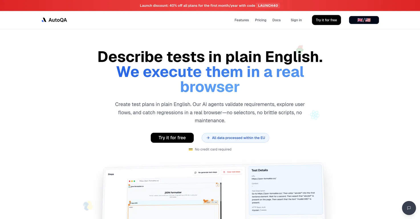 AutoQA - это платформа для обеспечения качества на основе искусственного интеллекта, которая позволяет командам тестировать веб-приложения без написания хрупких скриптов или полагаясь на селекторы. Вместо традиционных фреймворков, требующих постоянного обслуживания, AutoQA позволяет описывать тестовые случаи на простом английском языке. Его интеллектуальные агенты переводят эти описания в исполняемые планы тестирования и запускают их непосредственно в реальном браузере, как это делают ваши пользователи.