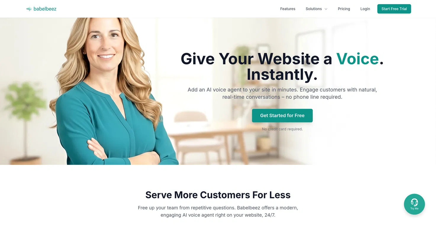 Babelbeez - это голосовой агент на базе искусственного интеллекта, который можно мгновенно добавить на ваш сайт. Специально разработанный для привлечения клиентов к голосовым разговорам в режиме реального времени, этот инструмент может быть развернут в считанные минуты и работает круглосуточно, обеспечивая мгновенную голосовую поддержку прямо на вашем сайте, сводя к минимуму необходимость в традиционных телефонных линиях.