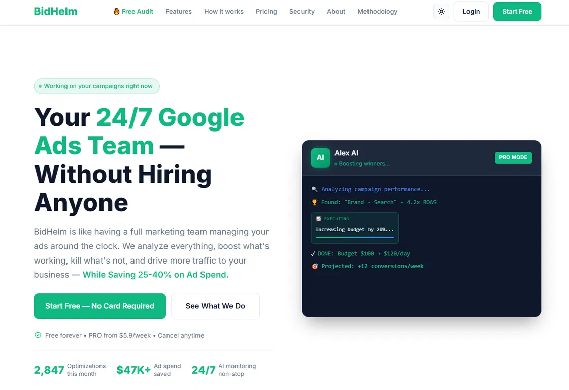 BidHelm - это ваша круглосуточная маркетинговая команда с искусственным интеллектом для Google Ads. Наш искусственный интеллект Alex анализирует ваши кампании, приостанавливает то, что тратит деньги, и увеличивает то, что работает. Он автоматически снижает ставки на недостаточно эффективные объявления, добавляет отрицательные ключевые слова, чтобы блокировать нерелевантные поисковые запросы, и корректирует бюджеты на основе реальных данных о результатах.