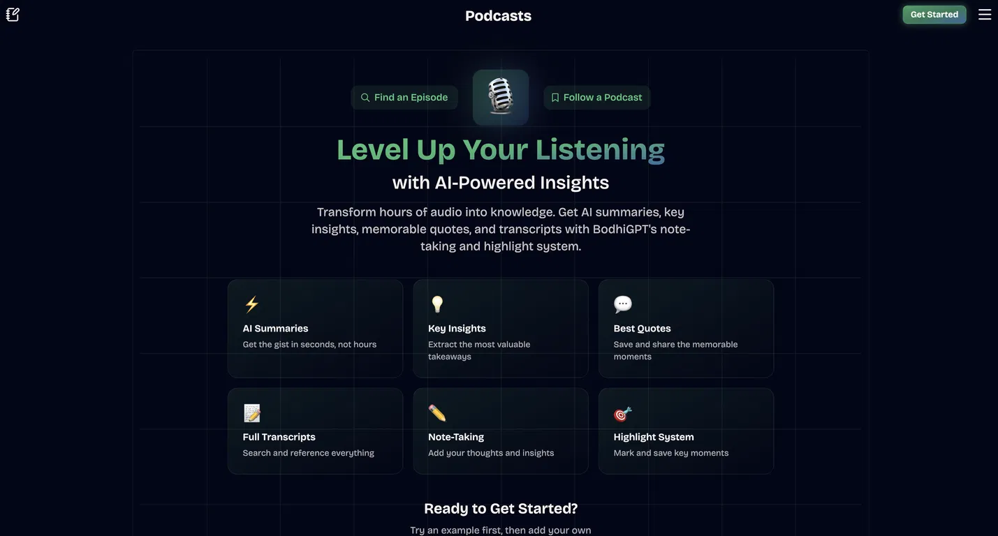 BodhiGPT Podcasts - это инструмент, предназначенный для изменения восприятия подкастов пользователями. Он функционирует как персонализированный подкаст-плеер, нацеленный на улучшение понимания и запоминания пользователем содержания подкаста.