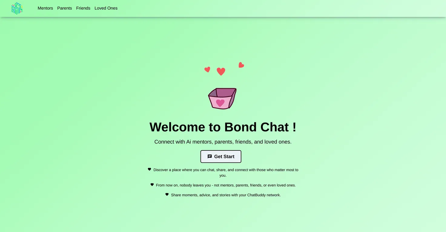 Bond Chat - это инструмент искусственного интеллекта, предназначенный для развития общения и связи между группами пользователей, такими как наставники, родители, друзья и любимые. Это веб-приложение, запрограммированное с помощью create-react-app, и для его работы требуется JavaScript.