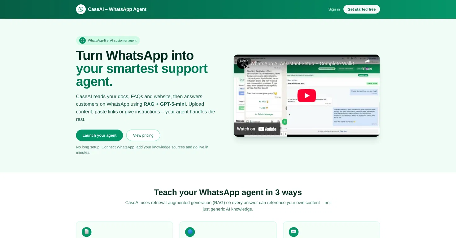 CaseAI WhatsApp Service - это инструмент обслуживания клиентов на основе искусственного интеллекта, специально разработанный для WhatsApp. Он создан для превращения WhatsApp в умного агента по обслуживанию клиентов благодаря использованию передовых технологий, таких как retrieval-augmented generation (RAG) и GPT-5-mini.
