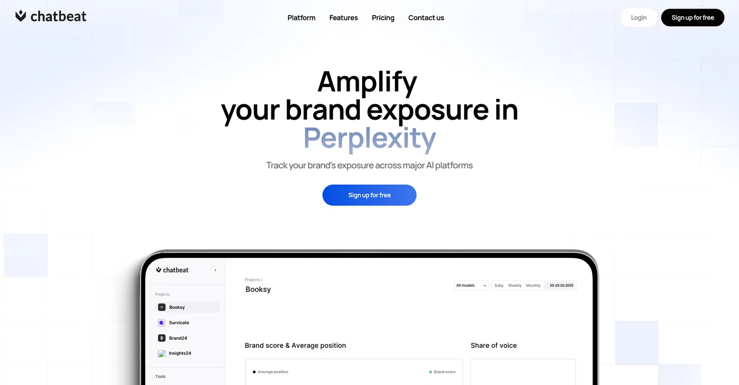 Ключевой особенностью Chatbeat является возможность усилить узнаваемость бренда на таких платформах, как ChatGPT, Gemini, Deepseek и Claude. Он предоставляет аналитику для отслеживания упоминаний, проверки точности информации, оценки настроений и выявления ключевых вопросов, которые часто задают пользователи.