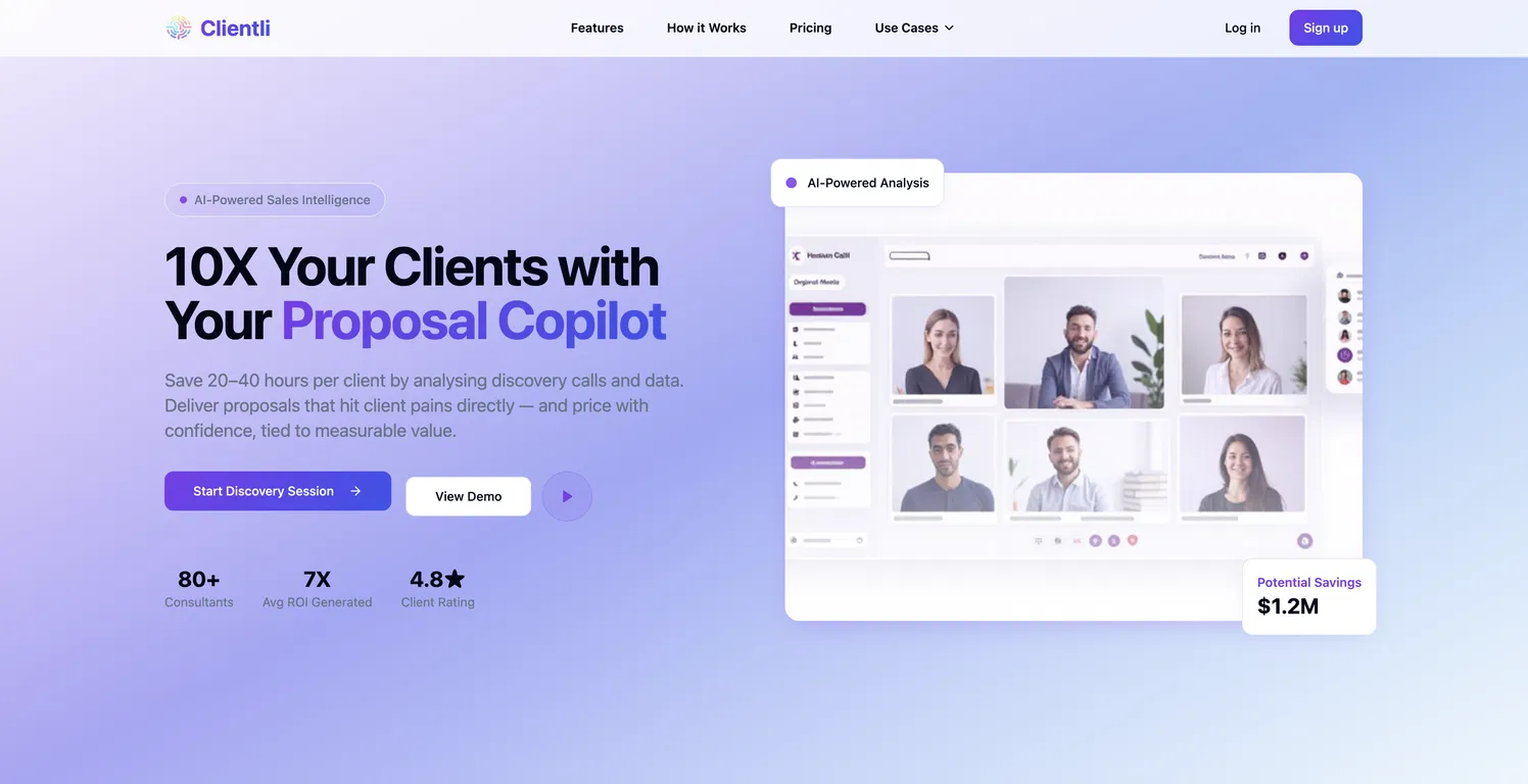 Clientli - это копилот на базе искусственного интеллекта, созданный для консультантов по цифровой трансформации и операционных директоров, которым нужно выиграть больше работы с меньшими усилиями. Он превращает беспорядочные поиски клиентов в четкие, убедительные предложения, обеспечивая уверенность в цене, согласованность с приоритетами клиента и возвращая несколько часов в неделю.