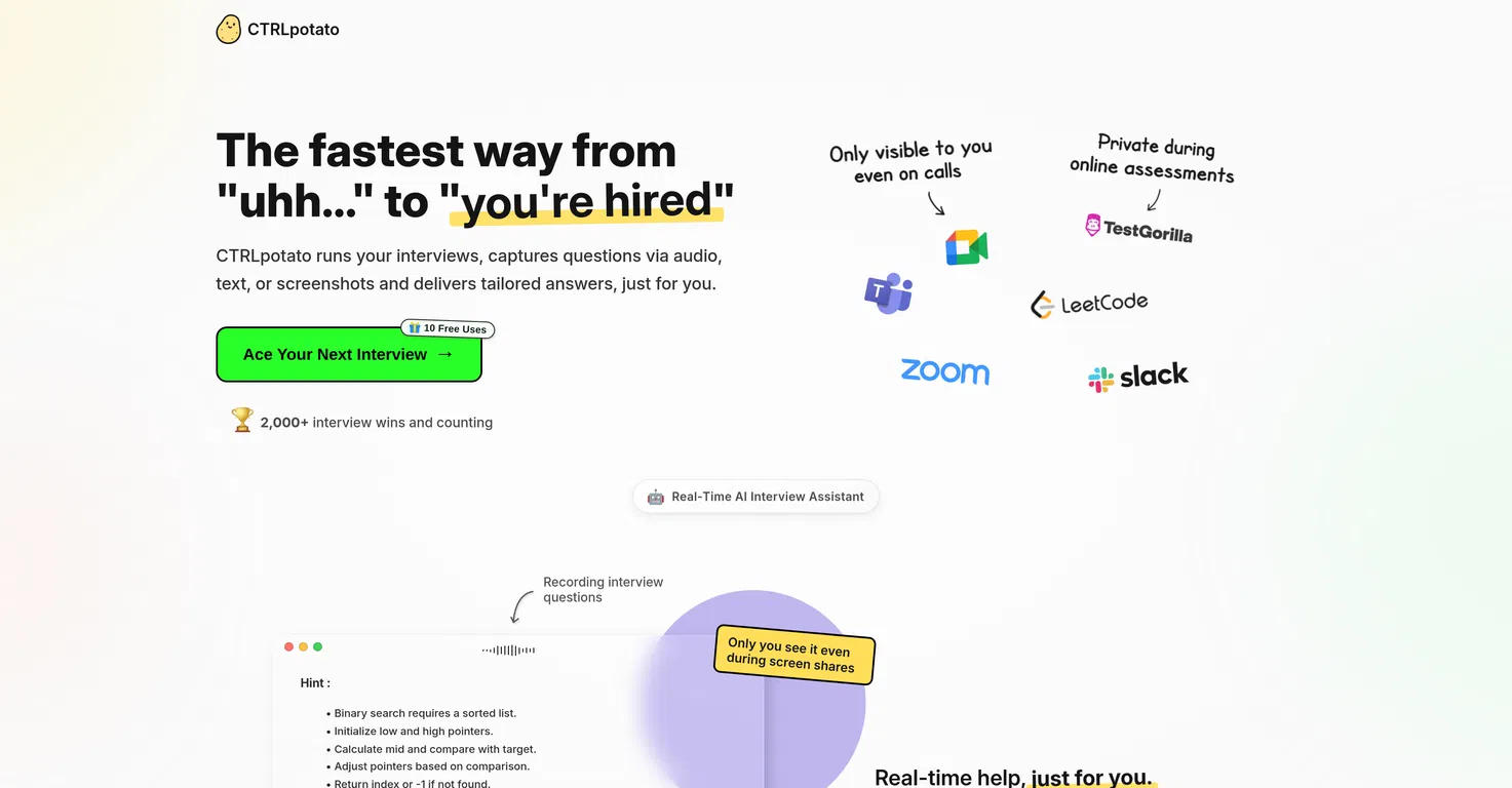 CTRLpotato - это помощник искусственного интеллекта в реальном времени для собеседований в macOS + Windows, задач по кодированию и проктивных онлайн-тестов.