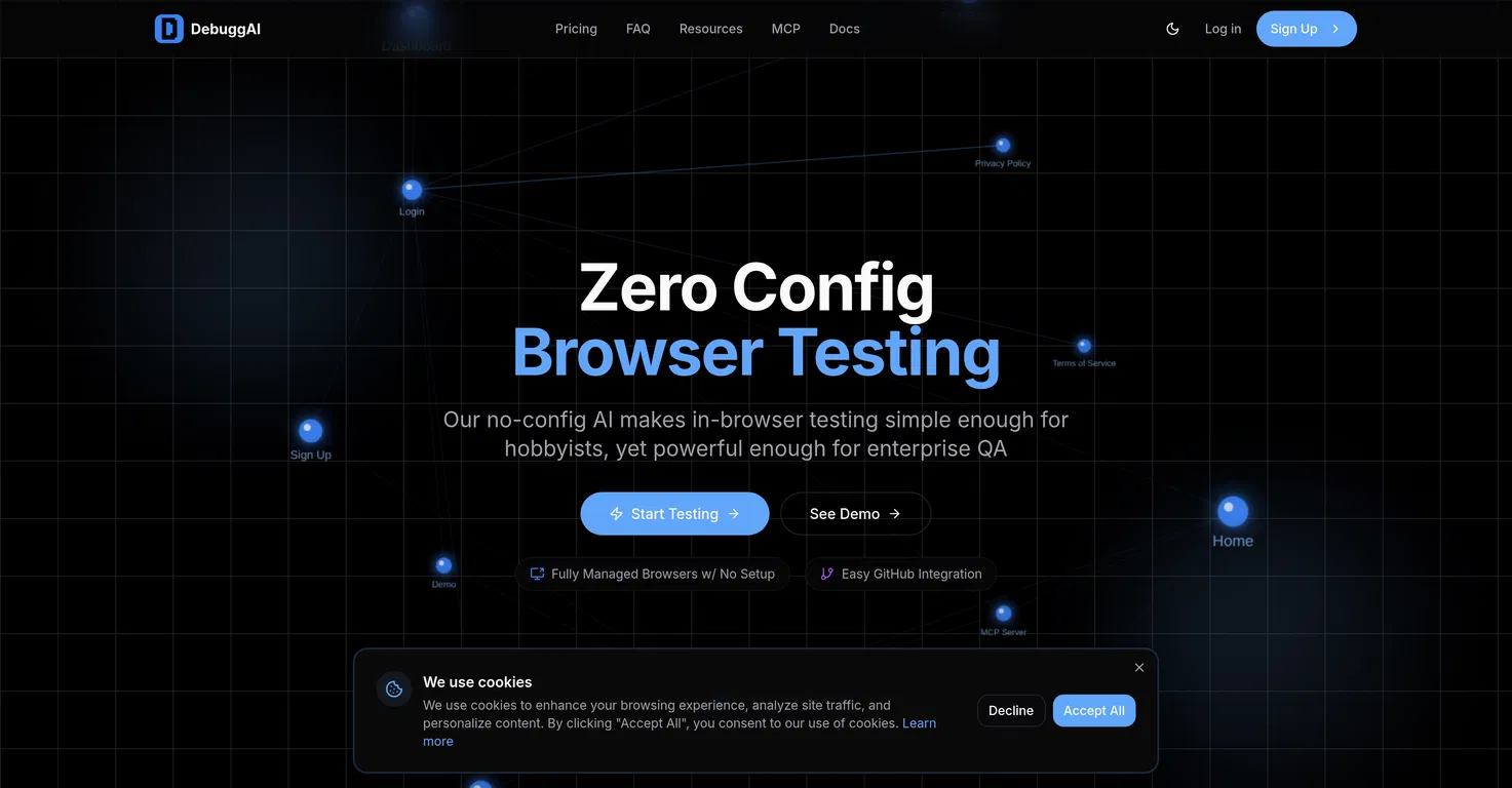 DebuggAI - это инструмент на базе искусственного интеллекта, который автоматизирует браузерное тестирование программных приложений. Инструмент интегрирован с GitHub, автоматизируя тестирование запросов на внесение изменений, тем самым гарантируя эффективность кода перед слиянием.