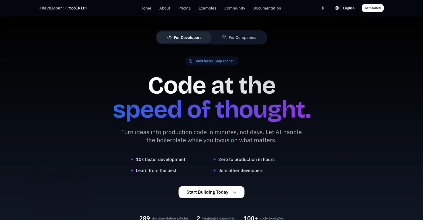 Developer Toolkit - это платформа с искусственным интеллектом для разработчиков и команд, которые хотят быстрее создавать, быстрее внедрять и сосредоточиться на главном. Превращая подсказки на естественном языке в готовый к производству код, она позволяет пройти путь от идеи до развертывания за считанные минуты, а не дни.