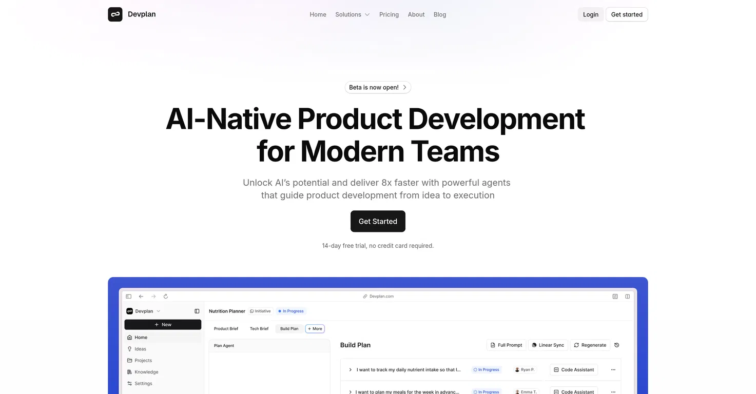 Devplan позволяет командам быстро планировать свои проекты с помощью управляемых агентами документов с требованиями к продукту (PRD), создания пользовательских историй и технических проектов, основанных на реальных рабочих процессах продукта.