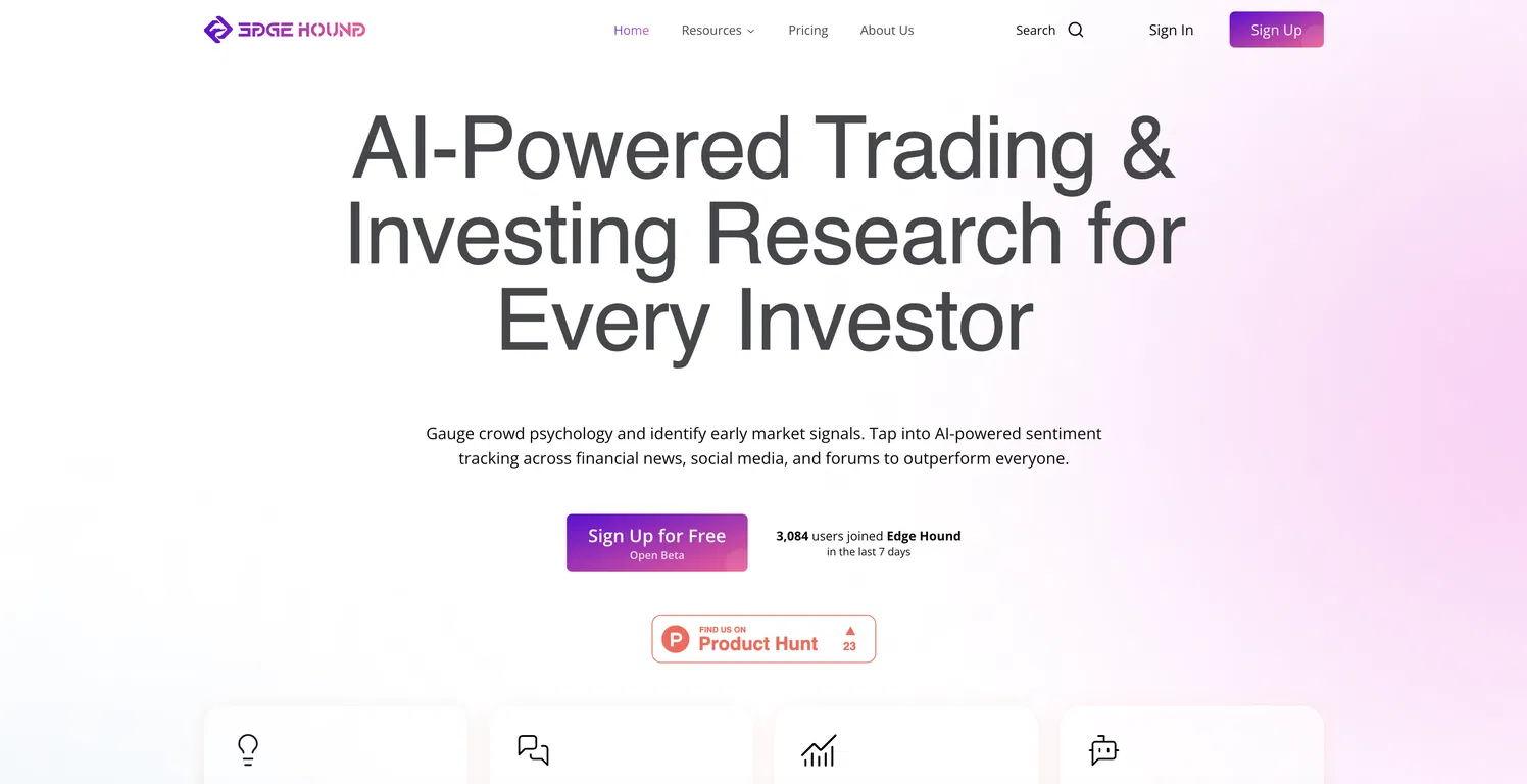 Edge Hound - это инструмент на основе искусственного интеллекта, предназначенный для помощи инвесторам в принятии обоснованных решений благодаря многоуровневому анализу рынка. Он предоставляет ряд услуг, таких как оценка психологии толпы, раннее выявление рыночных сигналов и отслеживание настроений на основе ИИ по финансовым новостям, социальным сетям и публичным форумам.