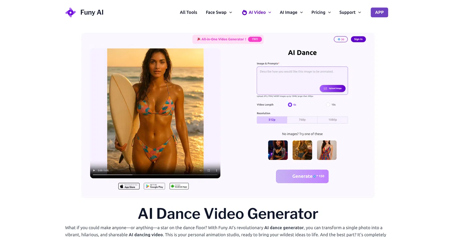 Художники также могут использовать его для оживления статичных персонажей. Funy AI's Dance Video Generator обещает высококачественную анимацию на выходе, результаты профессионального уровня и простоту использования.