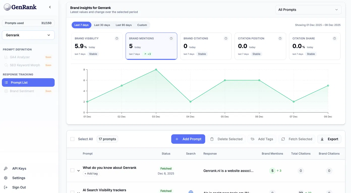 GenRank — это инструмент, предназначенный для мониторинга, анализа и оптимизации упоминаний бренда в ChatGPT.