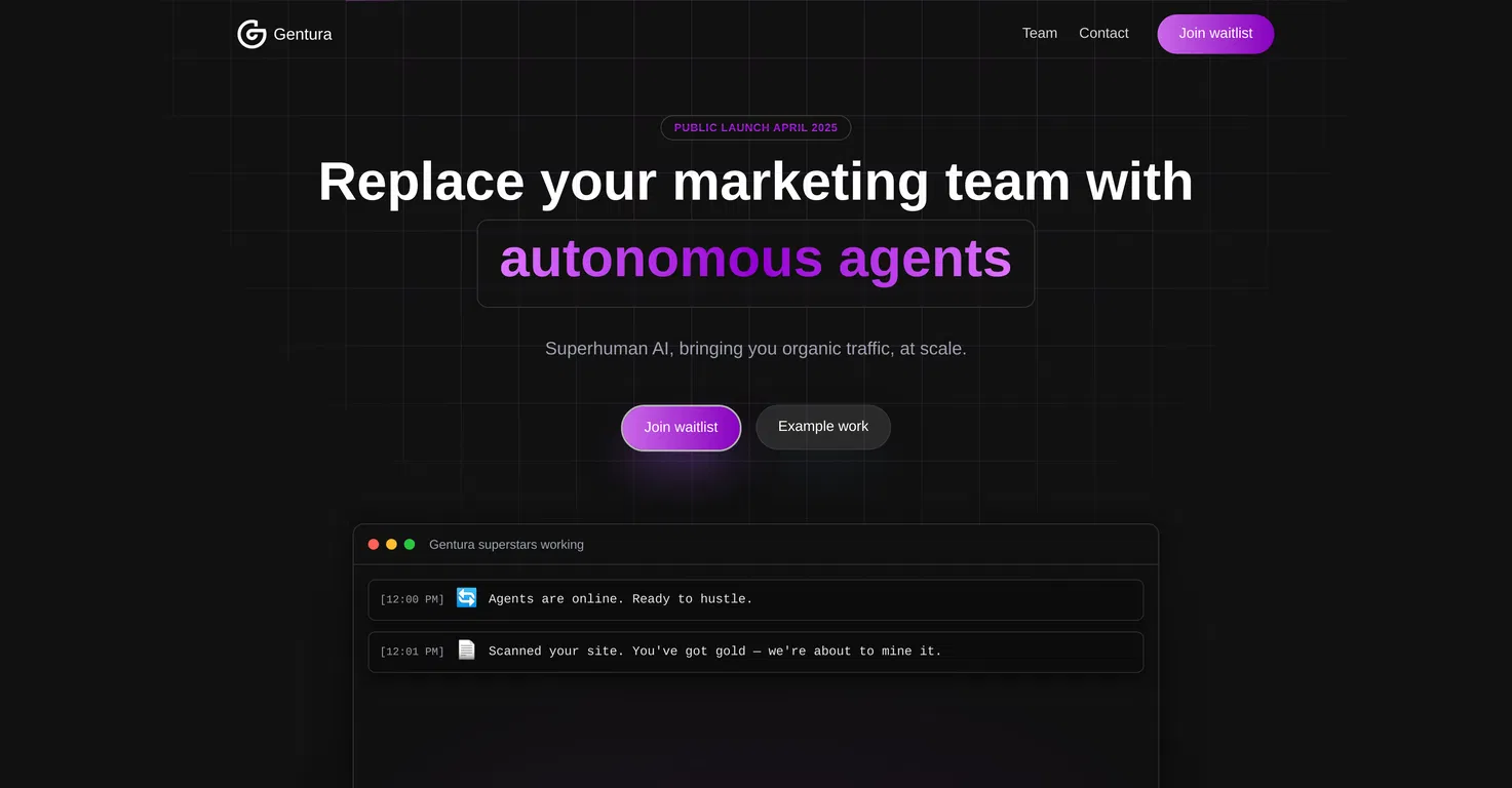 Gentura - это автономный маркетинговый инструмент с искусственным интеллектом, призванный заменить традиционные маркетинговые команды. Его функциональность сосредоточена вокруг автономных агентов, которые пишут и публикуют статьи для привлечения органического трафика на ваш сайт.