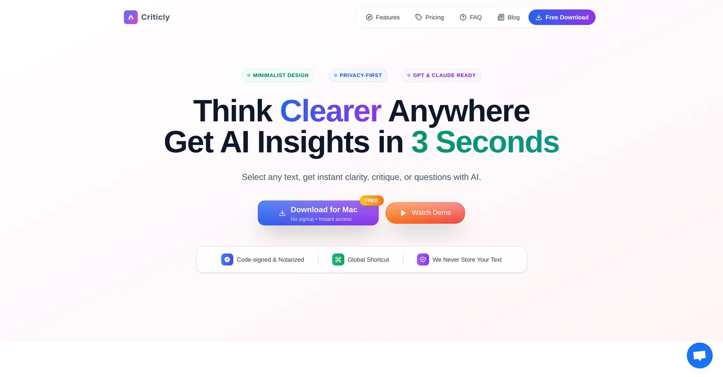 Criticly - это компаньон с искусственным интеллектом для критического мышления, созданный с учетом требований конфиденциальности, чтобы помочь вам мгновенно анализировать, подвергать сомнению и дорабатывать идеи. Доступное в виде легкого приложения для Mac и Windows, Criticly позволяет выбрать любой текст из электронной почты, научных работ, сообщений Slack или веб-страниц и получить структурированные выводы, критические замечания и уточняющие вопросы за считанные секунды.