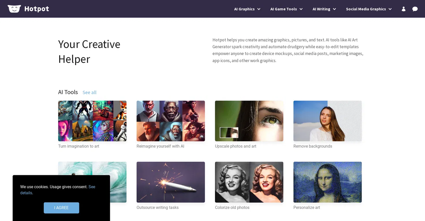 Инструменты AI Object Remover и Background Remover позволяют пользователям быстро удалять нежелательные детали с изображений. В Hotpot также есть генератор цвета, улучшитель лица и восстановитель изображения, которые помогают пользователям настраивать изображения, а также копирайтер, который помогает пользователям победить писательский блок и создавать убедительные истории, описания продуктов, рекламу Google и многое другое.