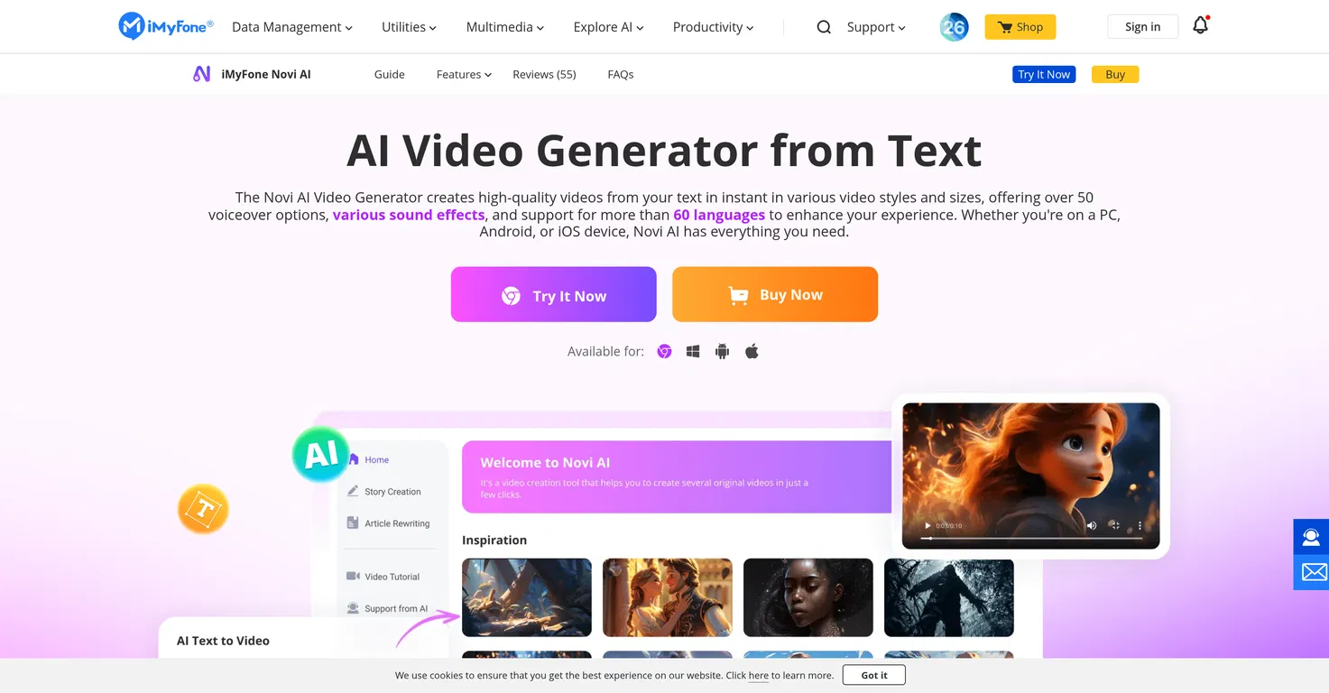 iMyFone Novi AI - это передовой инструмент для создания видео на основе искусственного интеллекта, который позволяет превращать истории, тексты и изображения в потрясающие высококачественные видеоролики всего одним щелчком мыши.
