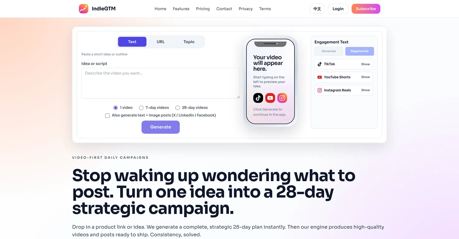 IndieGTM - это маркетинговая операционная система, предназначенная для помощи основателям инди-компаний в создании и управлении стратегическими кампаниями для их постов и коротких видео.