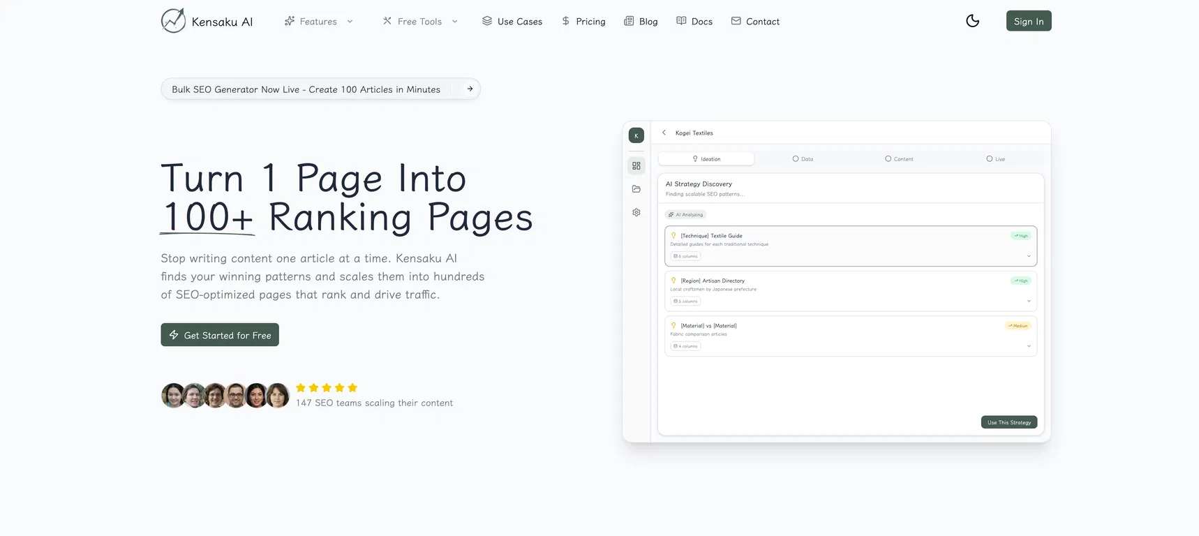 Я создал Kensaku AI, чтобы решить эту проблему. Это полноценный программный SEO-движок, призванный превратить 1 успешную страницу в 100+ ранжируемых страниц без технической головной боли. Используя подход к созданию контента, основанный на данных, мы гарантируем, что контент будет человеческим, легко читаемым для краулеров и, самое главное, масштабируемым.
