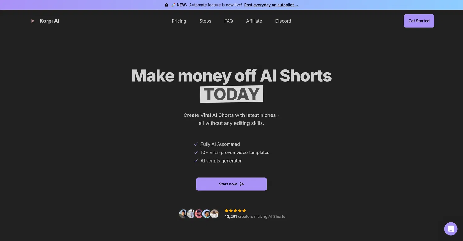 Korpi AI - это платформа, разработанная для помощи создателям в создании вирусных видеороликов для социальных сетей с помощью алгоритмов искусственного интеллекта. Благодаря удобному интерфейсу и автоматизированной системе искусственного интеллекта она упрощает сложную задачу редактирования видео и может быть эффективно использована создателями любого уровня подготовки.