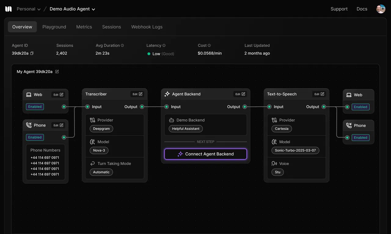 Разработчики могут начать работу с помощью одной команды CLI, подключить любой LLM, агентский фреймворк или пользовательскую логику с помощью одного веб-хука, а также использовать наши фронтенд SDK или подключить телефонный номер, чтобы позволить пользователям разговаривать с агентом.