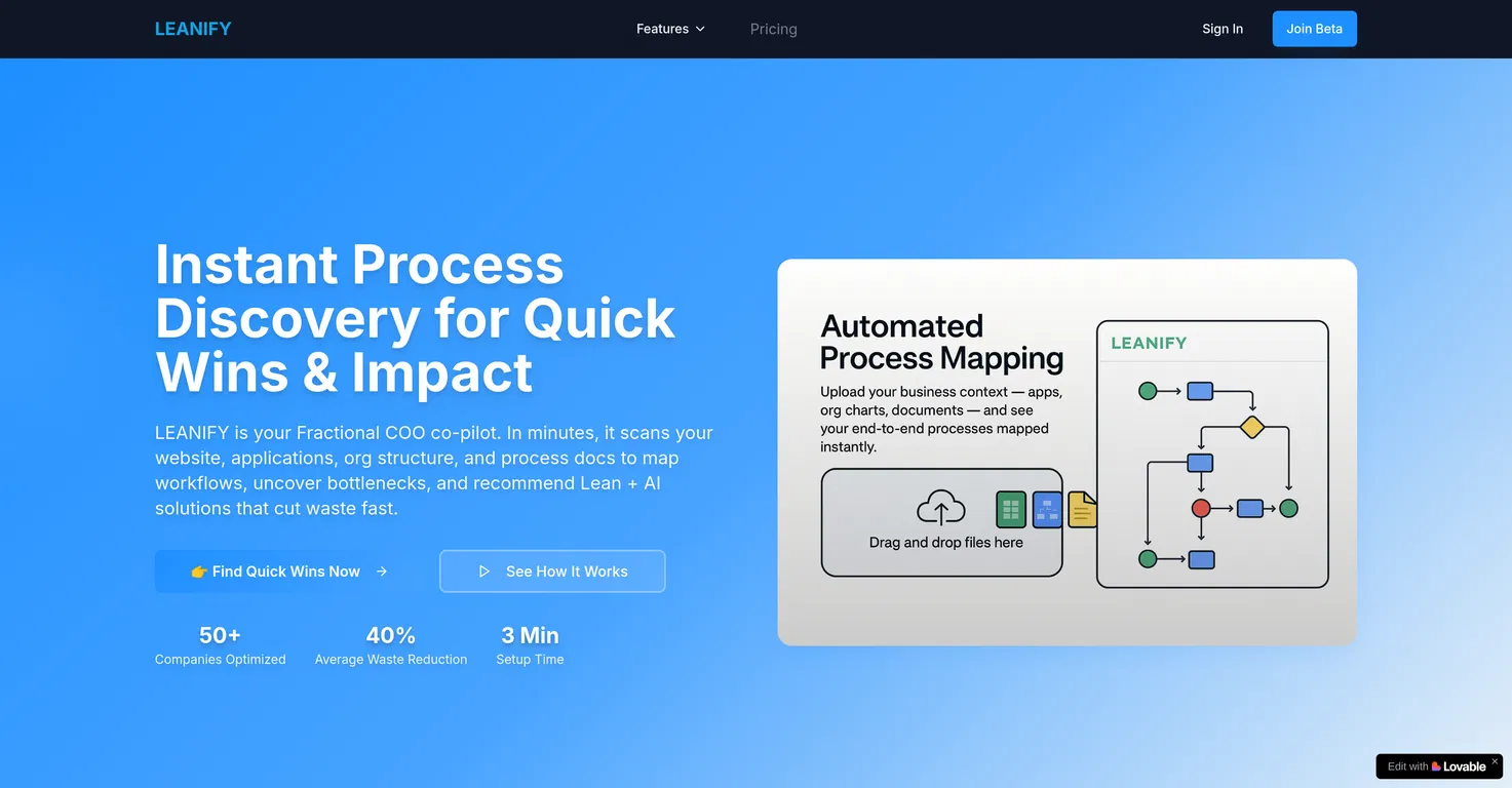 LEANIFY - это инструмент на базе искусственного интеллекта, который помогает оптимизировать операции. Он функционирует как фракционный COO Co-Pilot, оказывая помощь в оптимизации бизнес-операций.