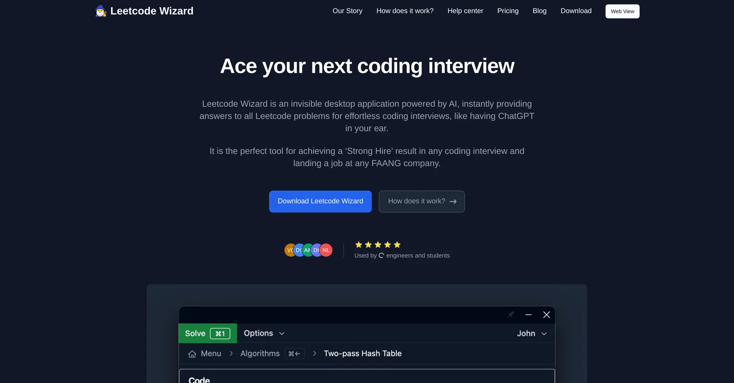 Leetcode Wizard - это новое настольное приложение с искусственным интеллектом, разработанное в первую очередь для помощи при прохождении собеседований по кодингу. Программа обеспечивает мгновенное решение проблем Leetcode, выступая в роли молчаливого партнера в вашем путешествии по кодингу.