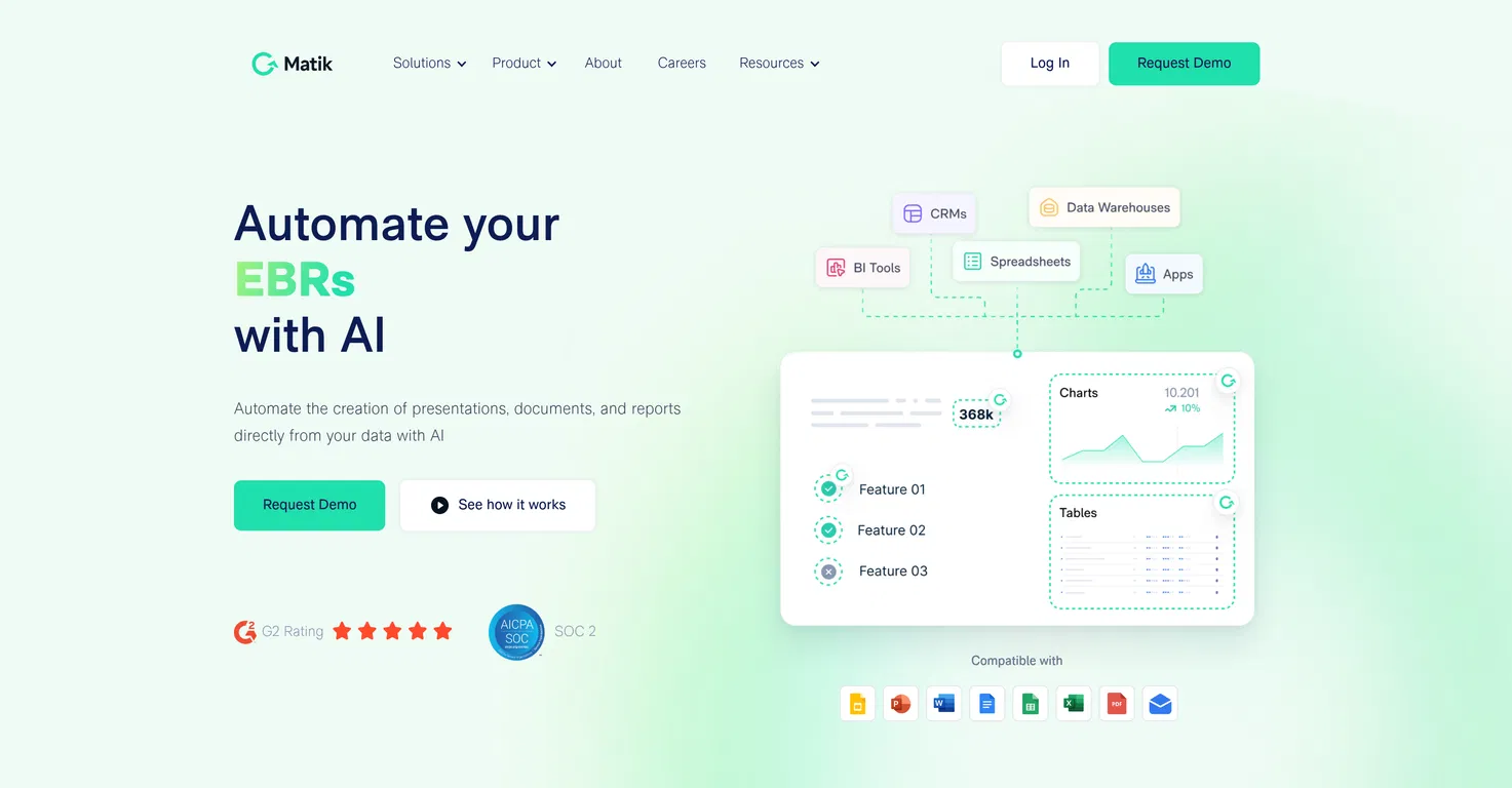 Matik - это программное обеспечение с искусственным интеллектом, основанное на данных и предназначенное для автоматизации создания контента. Основная функция этого инструмента - автоматизация создания персонализированных презентаций, отчетов и документов непосредственно на основе данных пользователя, что повышает эффективность и точность.