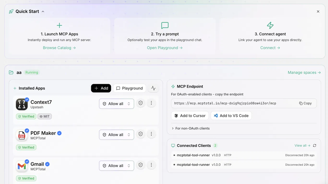 MCPTotal.io - это недавно запущенная, 100% бесплатная платформа для запуска и управления MCP-приложениями в масштабе, с полной уверенностью при подключении облачных аккаунтов. Каждое MCP работает на изолированных серверах в песочнице с токенами, встроенными средствами управления и контролем в режиме реального времени, поэтому безопасность никогда не замедлит работу.