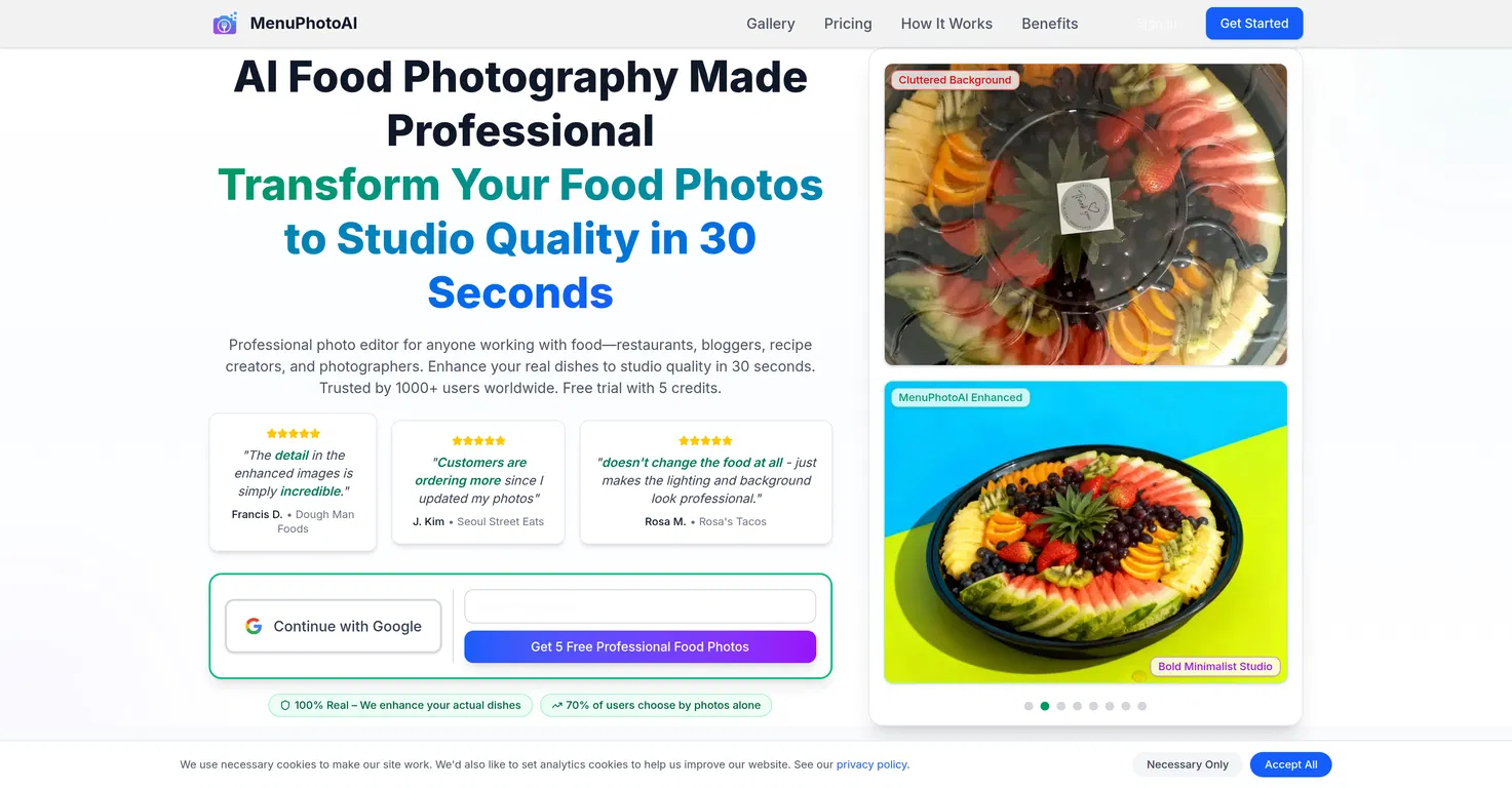 MenuPhotoAI — это профессиональный инструмент искусственного интеллекта, предназначенный для улучшения фотографий еды до студийного качества. Он в основном используется ресторанами, блогерами, авторами рецептов и фотографами для повышения привлекательности своих изображений, связанных с едой, за очень короткий период времени — примерно 30 секунд.