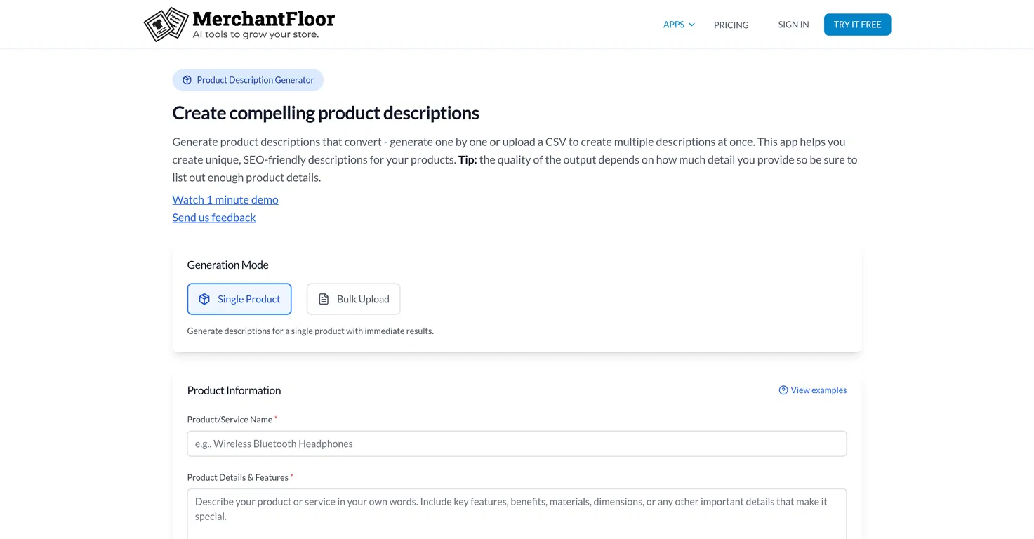 Благодаря двум режимам генерации - одиночный продукт и массовая загрузка - вы можете настроить рабочий процесс в соответствии с вашими потребностями. За считанные секунды можно написать убедительные описания для одного товара или загрузить CSV-файл для создания нескольких описаний сразу, что идеально подходит для масштабного обновления инвентаря.