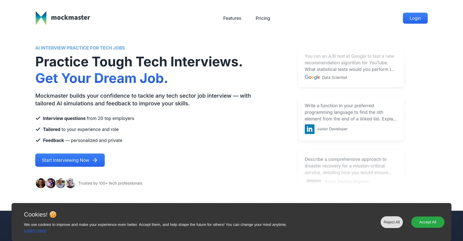 Mockmaster предлагает обратную связь в реальном времени на основе искусственного интеллекта, чтобы помочь пользователям улучшить свои навыки и укрепить уверенность в себе, предоставляя вопросы от ведущих работодателей и корректируя содержание в зависимости от опыта и конкретной роли пользователя.