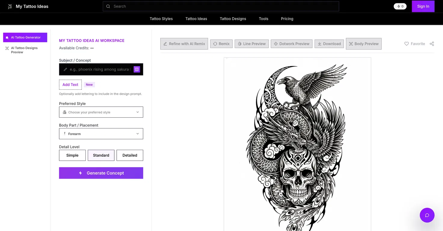 My Tattoo Ideas — это бесплатный генератор татуировок на основе искусственного интеллекта, который позволяет пользователям создавать уникальные идеи татуировок и просматривать их на разных частях тела. Эта платформа содержит рабочее пространство с искусственным интеллектом, где пользователи могут выбрать предпочтительный стиль татуировки, часть тела для размещения и уровень детализации, что позволяет им настраивать свои концепции татуировок.