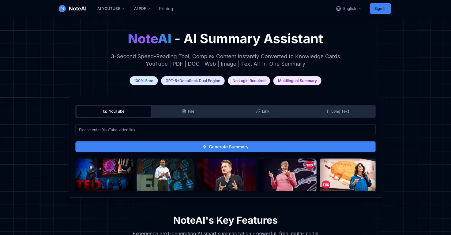 Этот помощник по подведению итогов с помощью искусственного интеллекта может быстро преобразовать сложный контент в удобные для восприятия карты знаний и mind maps. NoteAI охватывает широкий спектр платформ, таких как YouTube, PDF, DOC, PPT, изображения и веб-ссылки, позволяя пользователям извлекать ключевые идеи из длинного контента одним щелчком мыши.