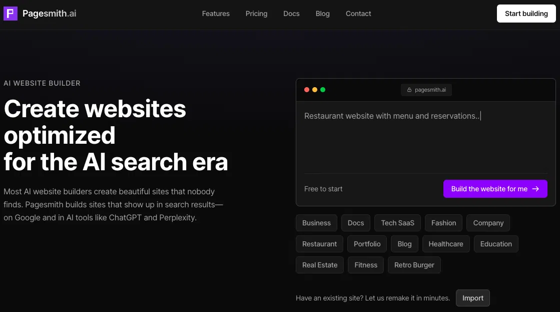 Pagesmith - это конструктор сайтов с искусственным интеллектом, ориентированный на контент. В то время как другие ИИ-конструкторы ориентированы на приложения и целевые страницы, Pagesmith создан для блогов, документации и маркетинговых сайтов с большим содержанием.