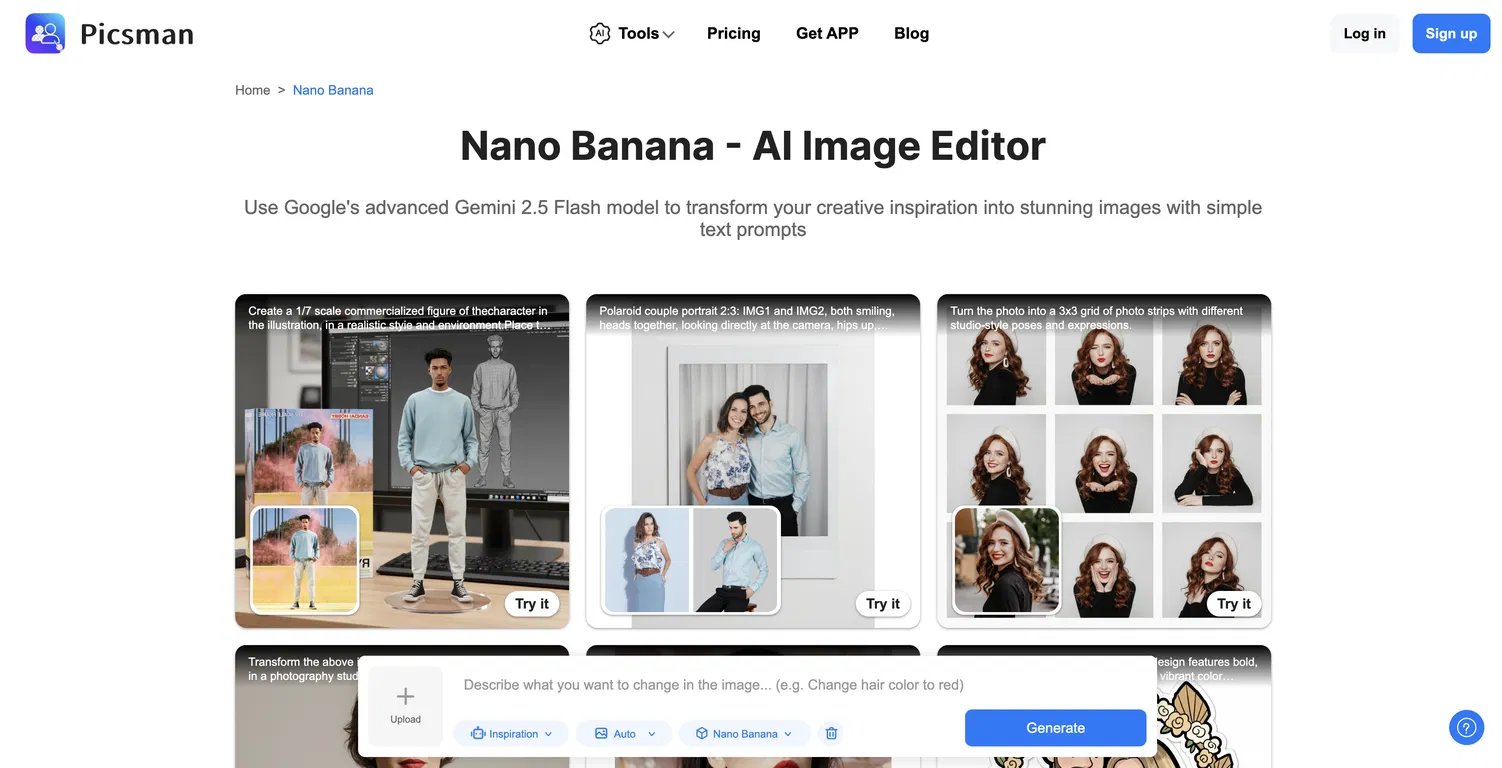 Picsman AI | Nano Banana - это продвинутая платформа для редактирования изображений с помощью искусственного интеллекта на базе флеш-модели Gemini 2.5 от Google. Она позволяет пользователям превращать простые текстовые подсказки в правки профессионального качества, генерировать 3D-фигурки, создавать фотосетки, менять наряды и применять художественные фильтры - и все это без использования Photoshop. Разработанный для веселого и практичного использования, Nano Banana делает редактирование изображений доступным как для творцов, коллекционеров, так и для обычных пользователей.