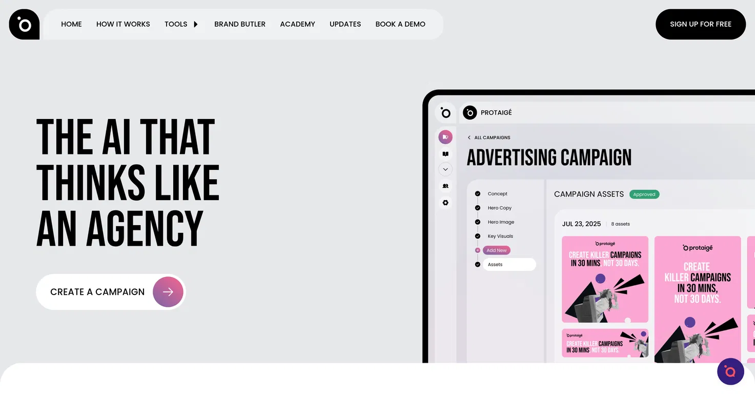 Большинство инструментов искусственного интеллекта предоставляют вам только отдельные элементы — здесь заголовок, там изображение. Вам приходится вручную соединять все это воедино. Protaigé отличается от них. Это комплексный маркетинговый механизм, который создает всю вашу кампанию, от стратегического брифа до готовых к запуску материалов.