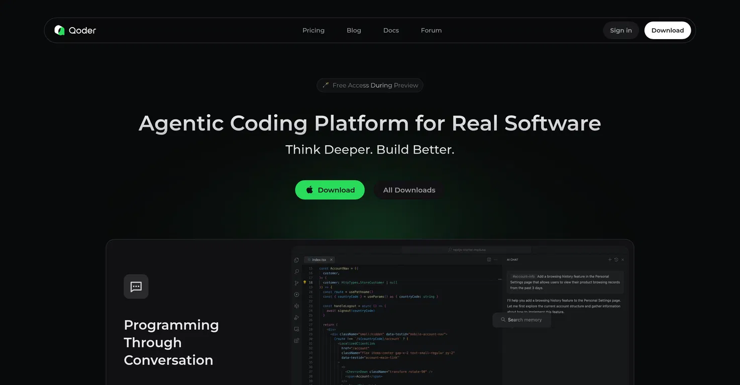 Qoder - это агентская платформа для кодинга на базе искусственного интеллекта, которая позволяет разработчикам создавать реальное программное обеспечение в процессе общения. В отличие от стандартных IDE или помощников по коду, агенты Qoder работают с расширенной информацией о контексте, глубоким пониманием кодовой базы и адаптивной памятью, что позволяет им автономно планировать, редактировать и тестировать целые проекты.