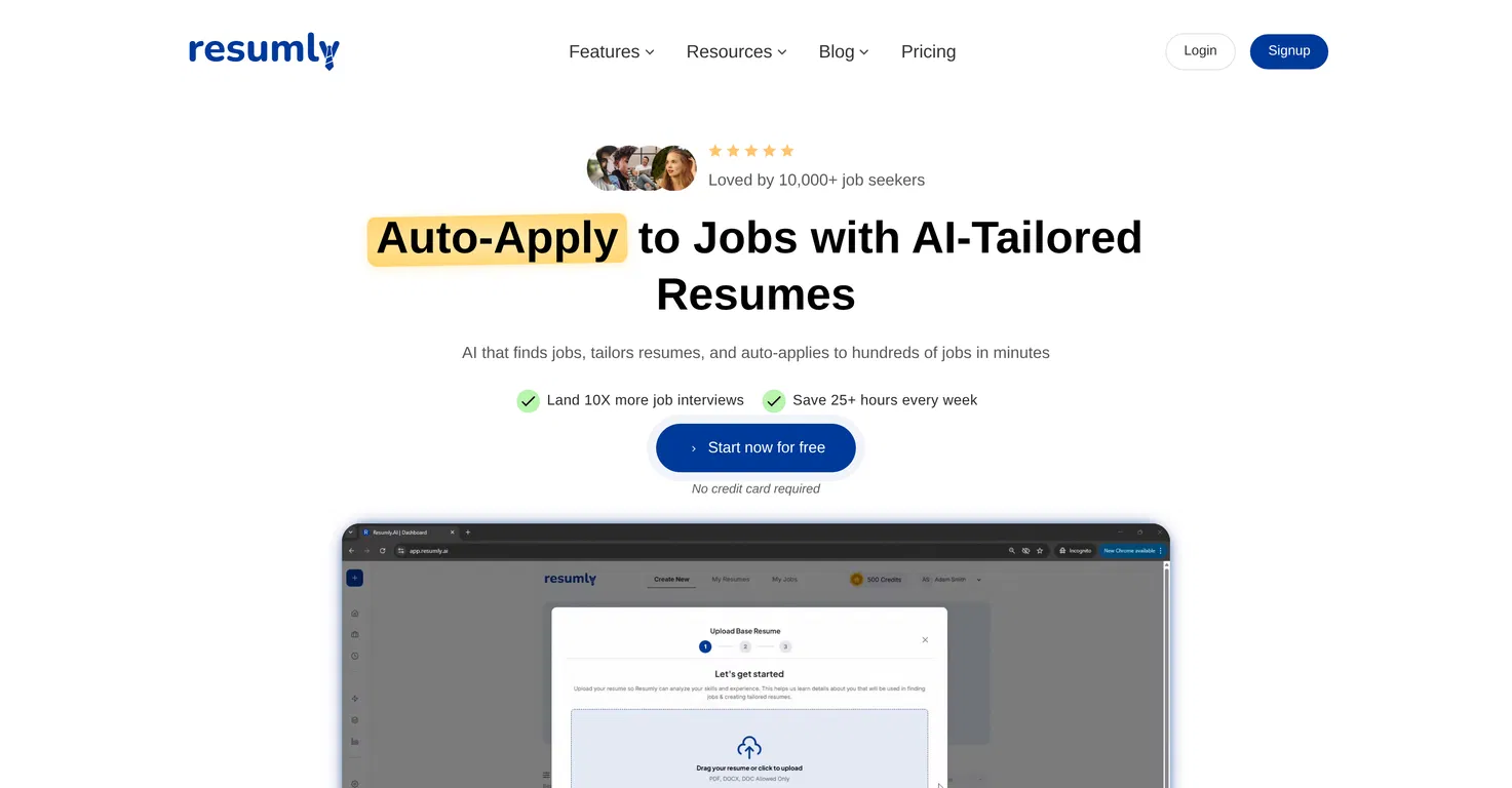 Resumly AI - это комплексная платформа для автоматизации поиска работы, которая избавляет вас от необходимости заполнять анкеты. Вместо того чтобы тратить часы на поиск и заполнение повторяющихся форм, Resumly находит нужные вакансии, подбирает резюме и сопроводительные письма, а также автоматически подает заявки - и все это за считанные минуты.