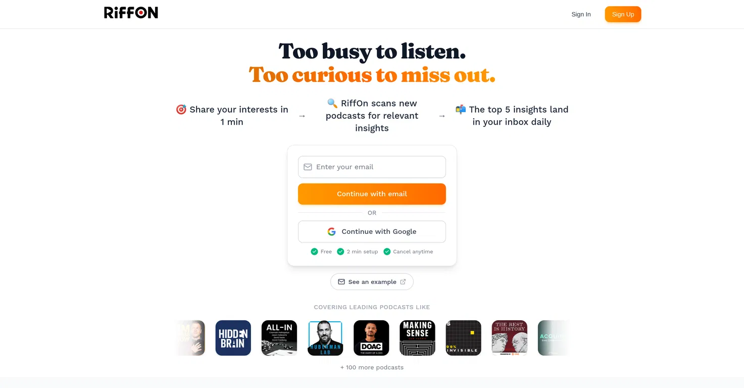 RiffOn - это платформа, управляемая искусственным интеллектом, настроенная на доставку актуальных подкастов прямо в почтовый ящик пользователя. Чтобы гарантировать, что она отвечает уникальному любопытству и склонностям пользователей, инструмент приглашает пользователей поделиться своими интересами, после чего он начинает просеивать новый контент подкастов, чтобы извлечь соответствующие идеи.